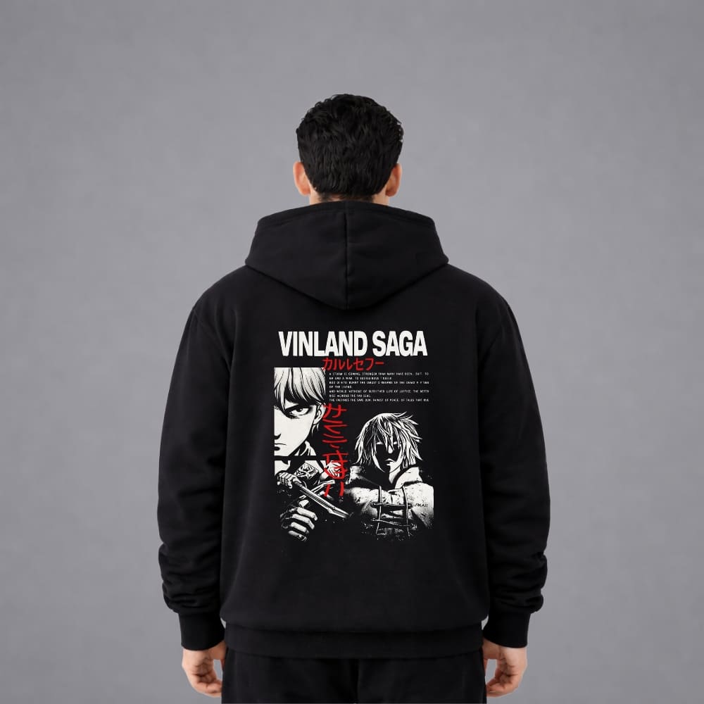 "Step into warrior mode with this Vinland Saga premium fleece hoodie, designed for anime fans who want bold style and serious comfort. Crafted with 300+ GSM heavyweight fleece, it delivers superior warmth a soft brushed interior and a premium feel that lasts. The powerful Vinland Saga graphic print on the back makes a strong statement, while the classic black color keeps it versatile for everyday wear. Built with durable stitching and high quality fabric, this hoodie is perfect for winter, casual outings, or leveling up your streetwear game. Why you’ll love it: Thick & warm fleece premium quality finish standout anime design, and all-day comfort a must have for true Vinland Saga fans."